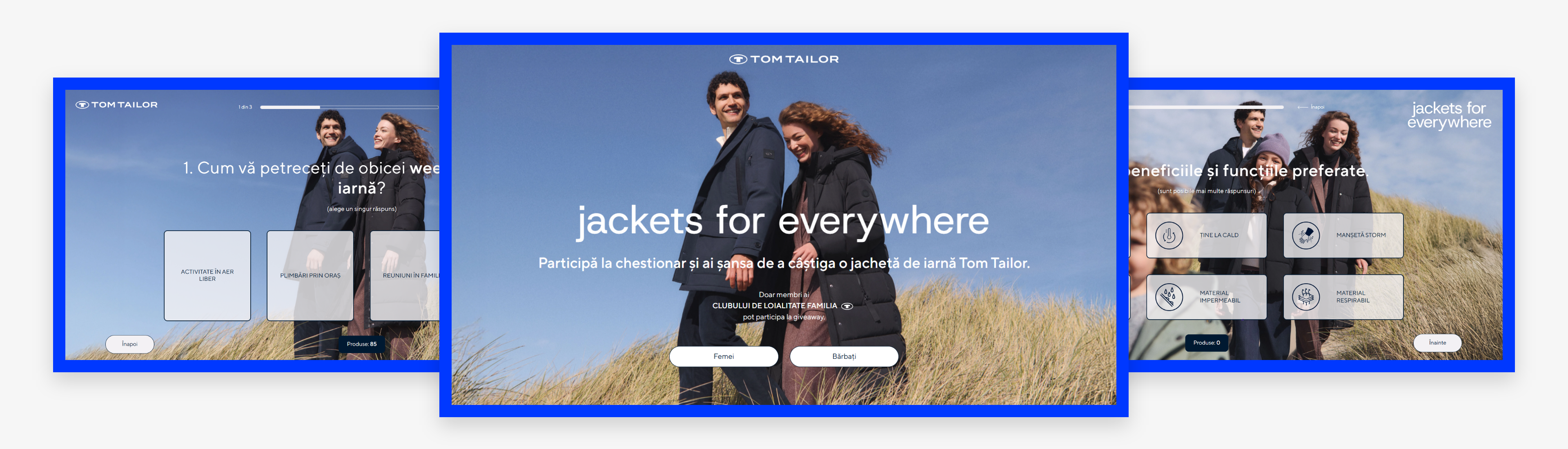 Zilele reci sunt chiar după colț, așa că acum este momentul perfect să te pregătești pentru temperaturile de iarnă. Participă la concursul nostru și câștigă marele premiu – o jachetă de iarnă Tom Tailor! Fiecare participant va primi o surpriză care cu siguranță îi va însenina ziua. O vom dezvălui după ce vei completa cu succes chestionarul, așa că nu uita să-ți verifici căsuța poștală de e-mail. Pentru a participa, trebuie să fii membru a FAMILIEI Clubului de Fidelitate Tom Tailor. Concursul este în perioada 10 - 25 Noiembrie 2025, inclusiv.