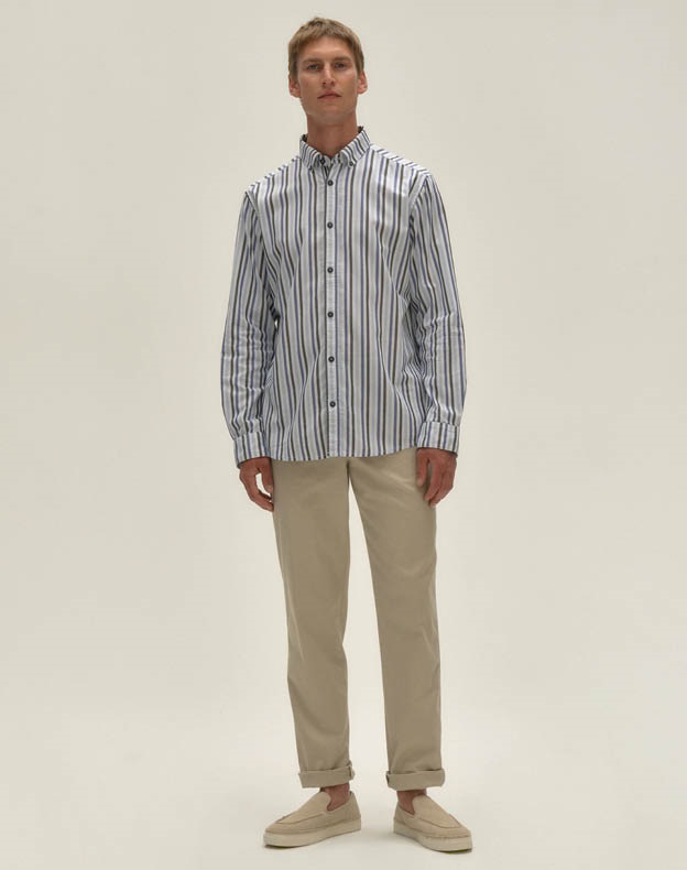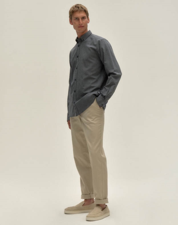 Dolge platnene hlače in polo majica z ovratnikom poskrbijo za poslovno sproščenost v kombinaciji z lahkotnejšim puloverjem, ki ga poveznemo čez ramena.