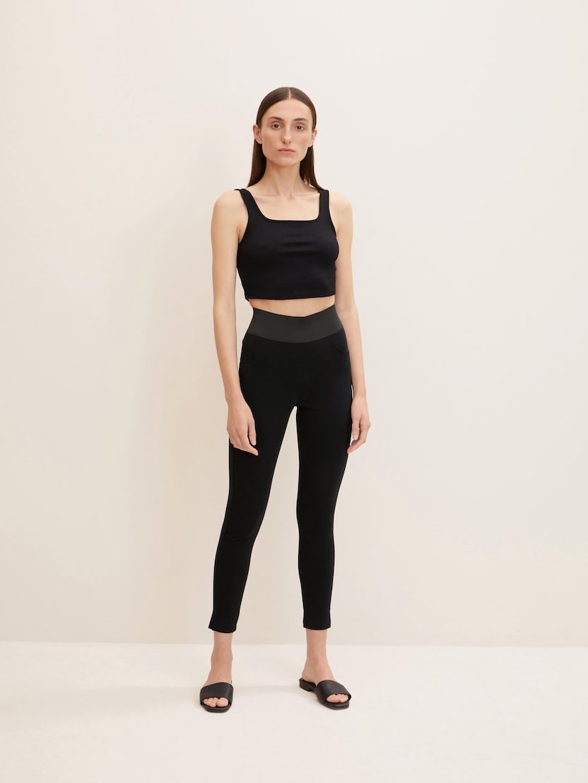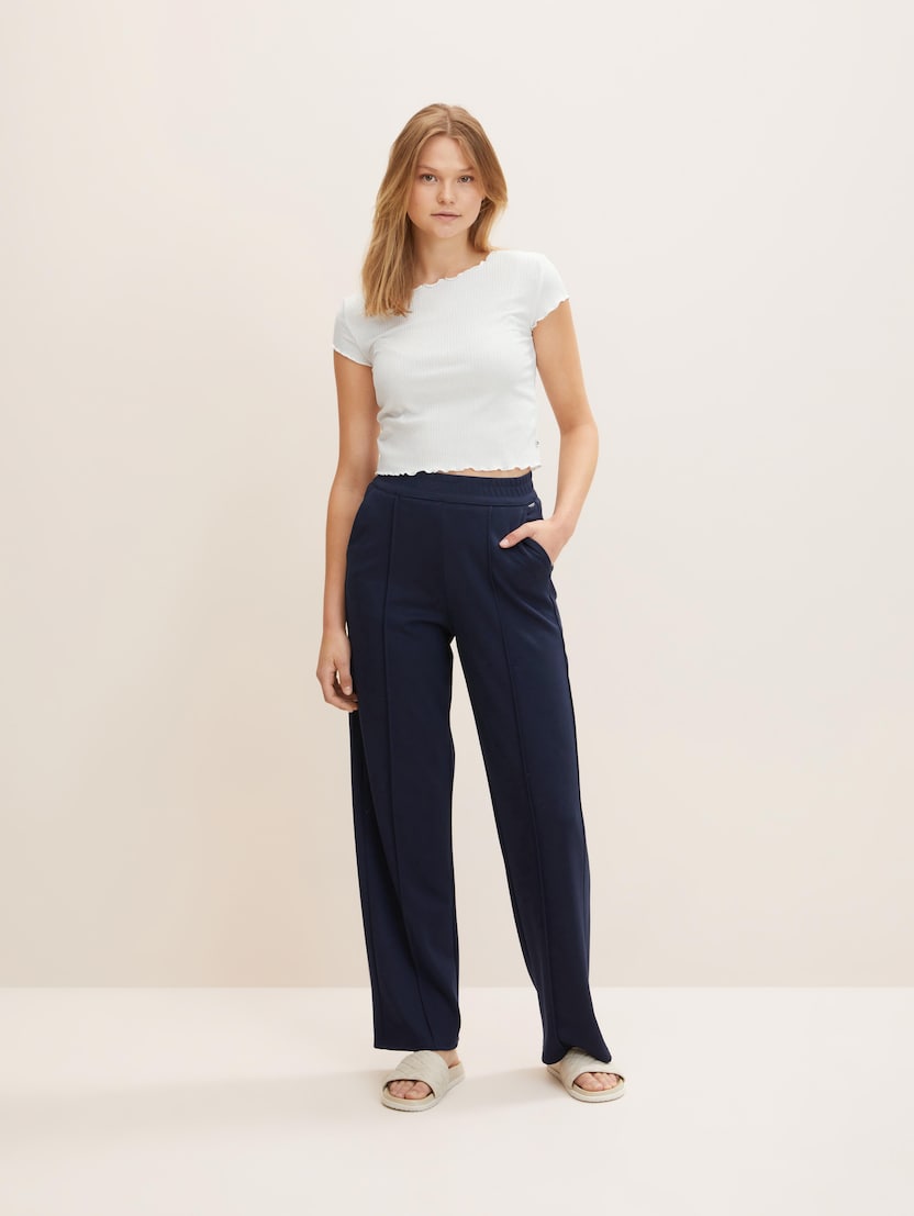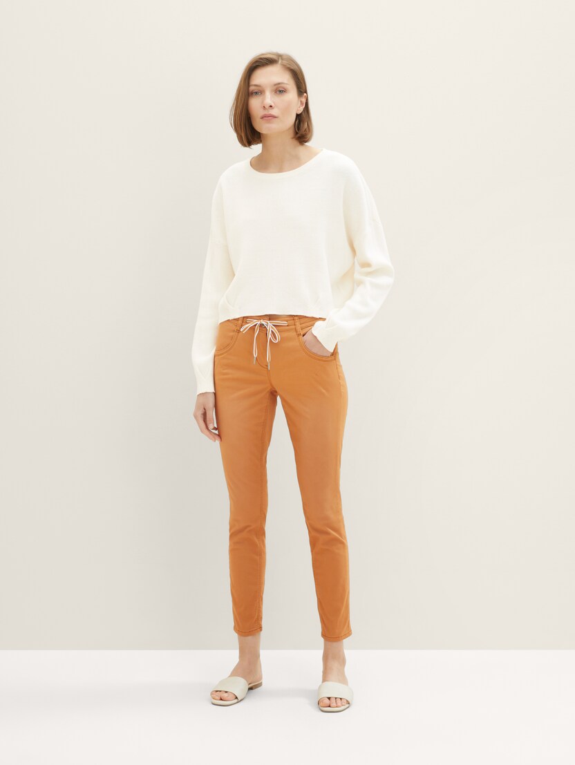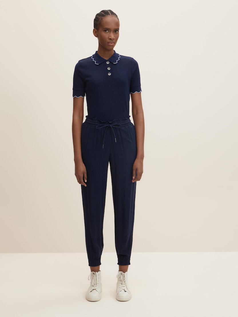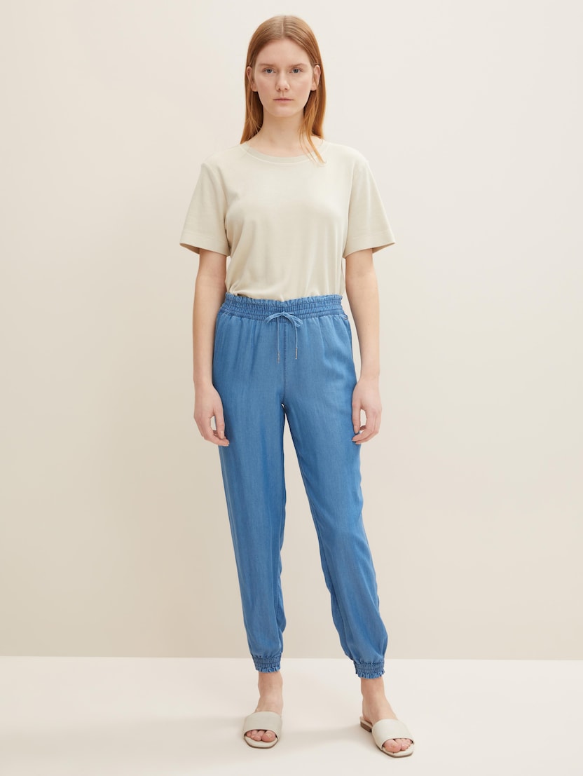 U usporedbi s klasičnim jogger hlačama, trenirka ima veći udio rastezljivog materijala – zbog čega izgleda malo elegantnije. Denim jogger hlače TOM TAILOR izrađene su od visokokvalitetnih tkanina s visokim udjelom viskoze i elastičnom vezicom za zatezanje. Djeluju vrlo sofisticirano i jedan su od najpopularnijih novih trendova u području ženske odjeće, bez gotovo ikakve razlike između hlača, trenirki i jogger hlača.