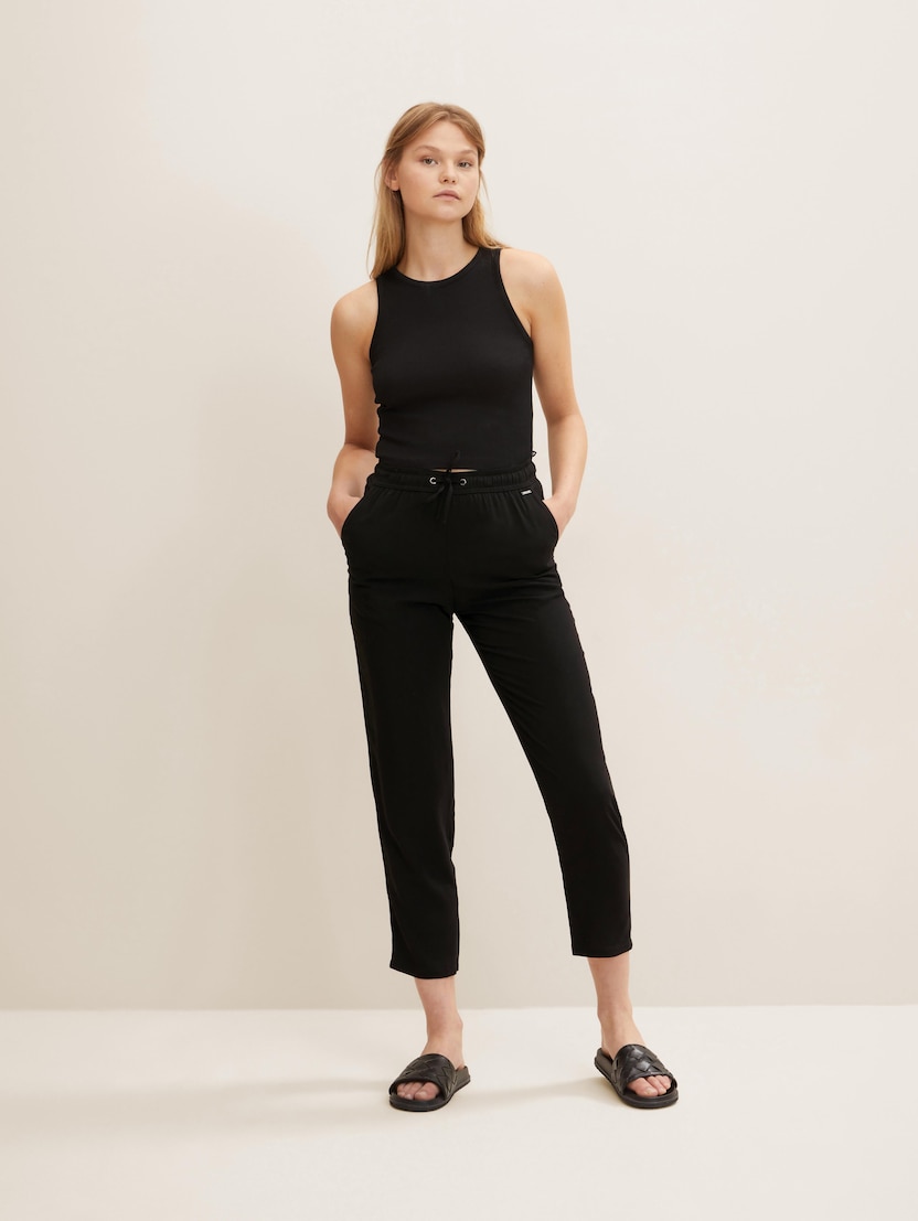 U usporedbi s klasičnim jogger hlačama, trenirka ima veći udio rastezljivog materijala – zbog čega izgleda malo elegantnije. Denim jogger hlače TOM TAILOR izrađene su od visokokvalitetnih tkanina s visokim udjelom viskoze i elastičnom vezicom za zatezanje. Djeluju vrlo sofisticirano i jedan su od najpopularnijih novih trendova u području ženske odjeće, bez gotovo ikakve razlike između hlača, trenirki i jogger hlača.