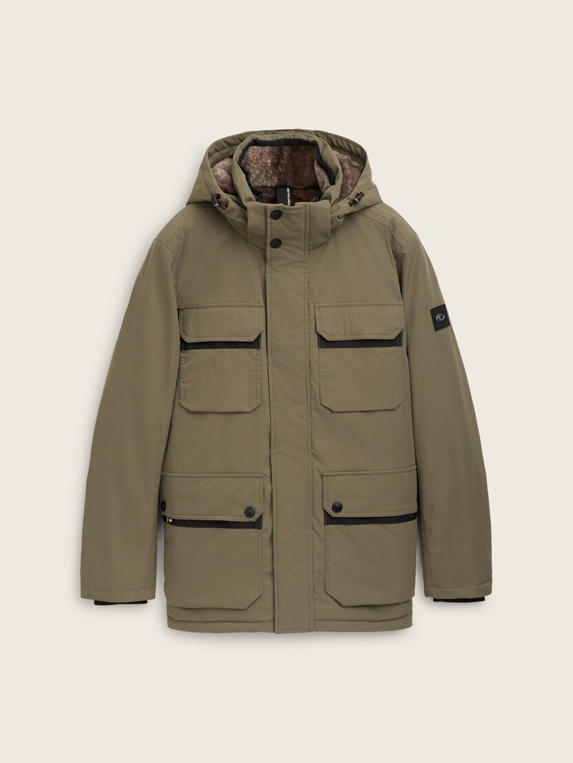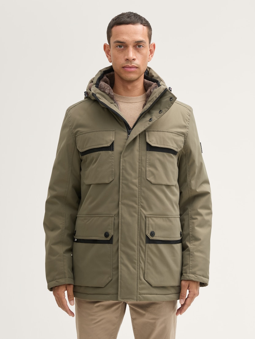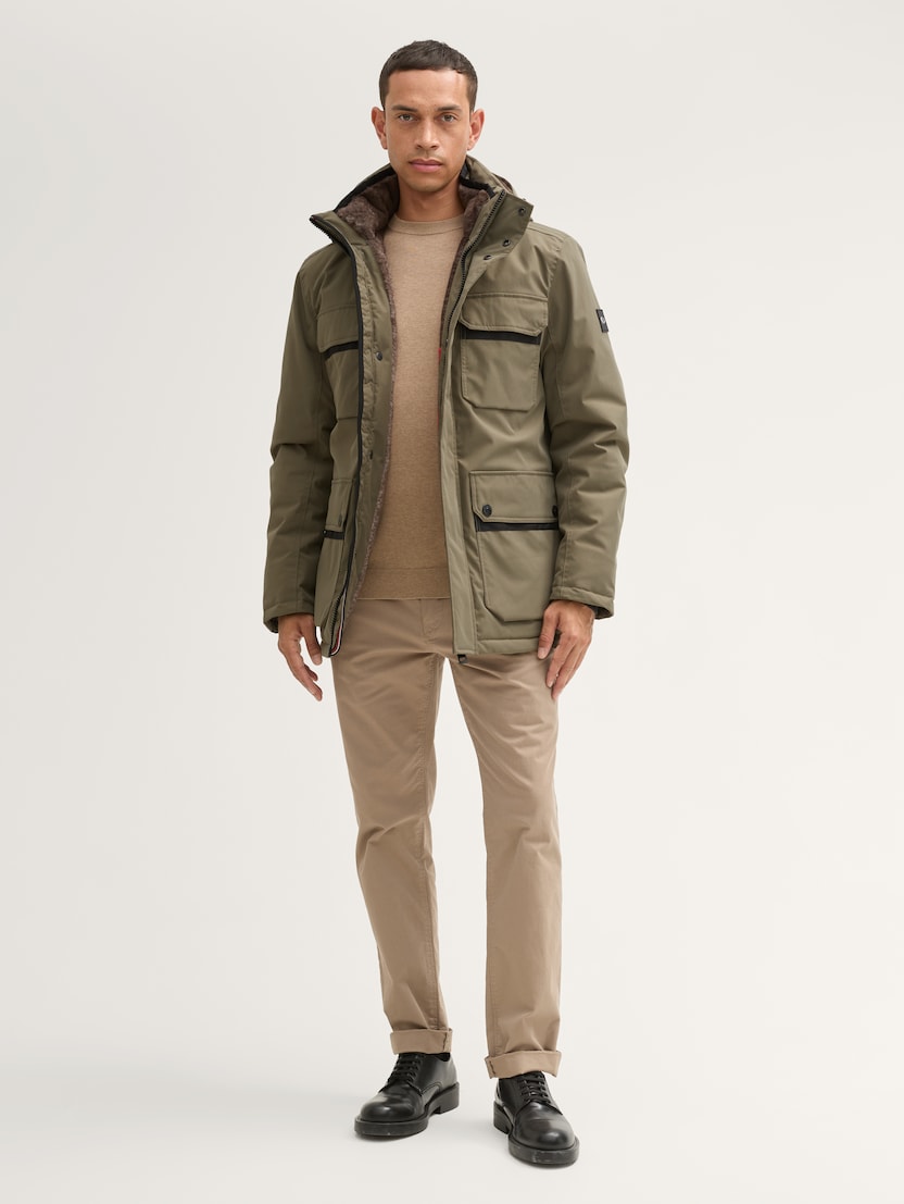 • două buzunare frontale şi două buzunare cu clapete şi o capsă pe piept